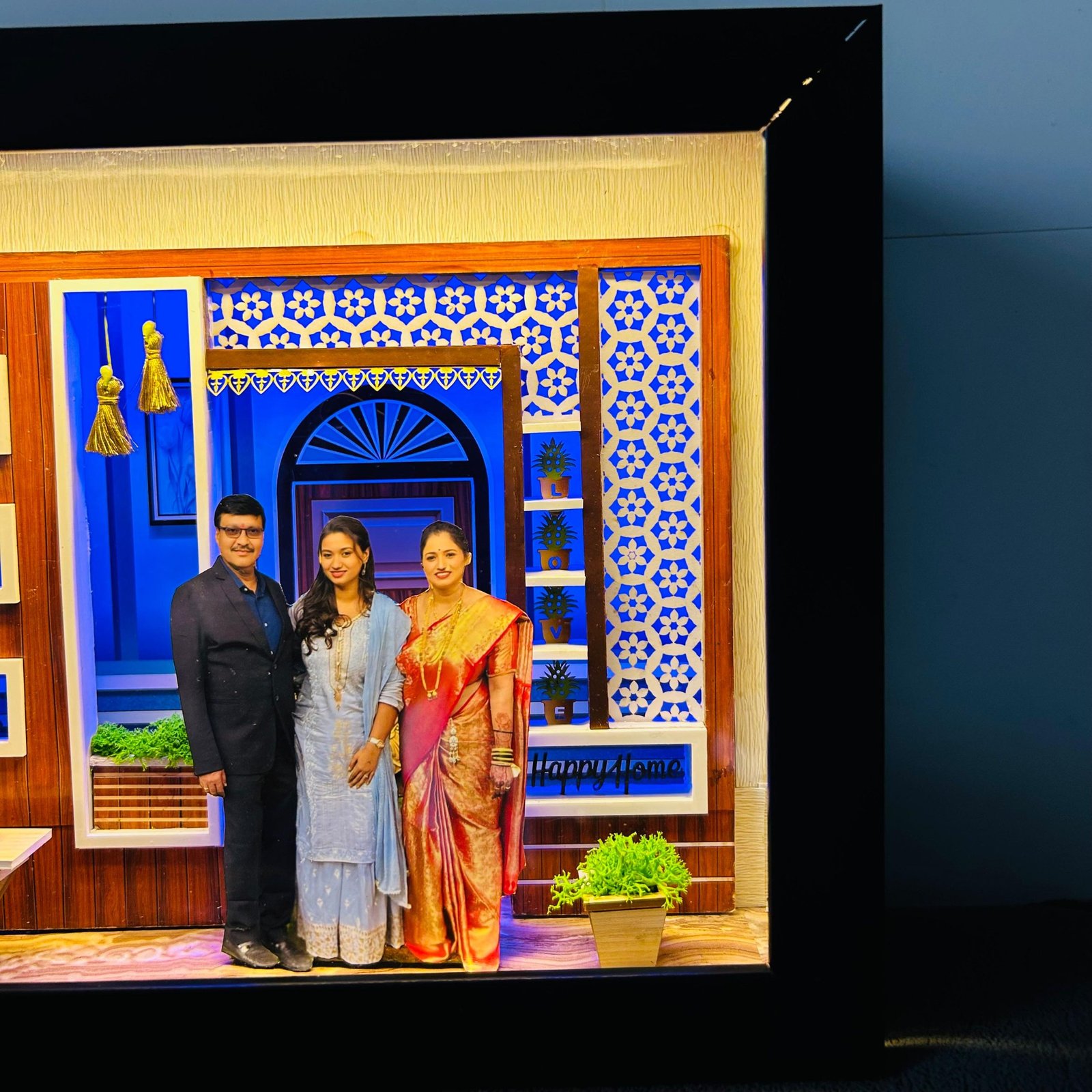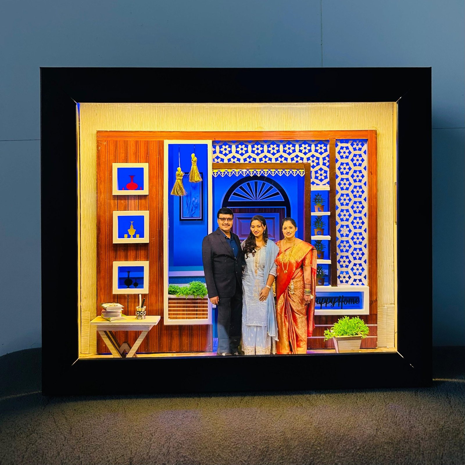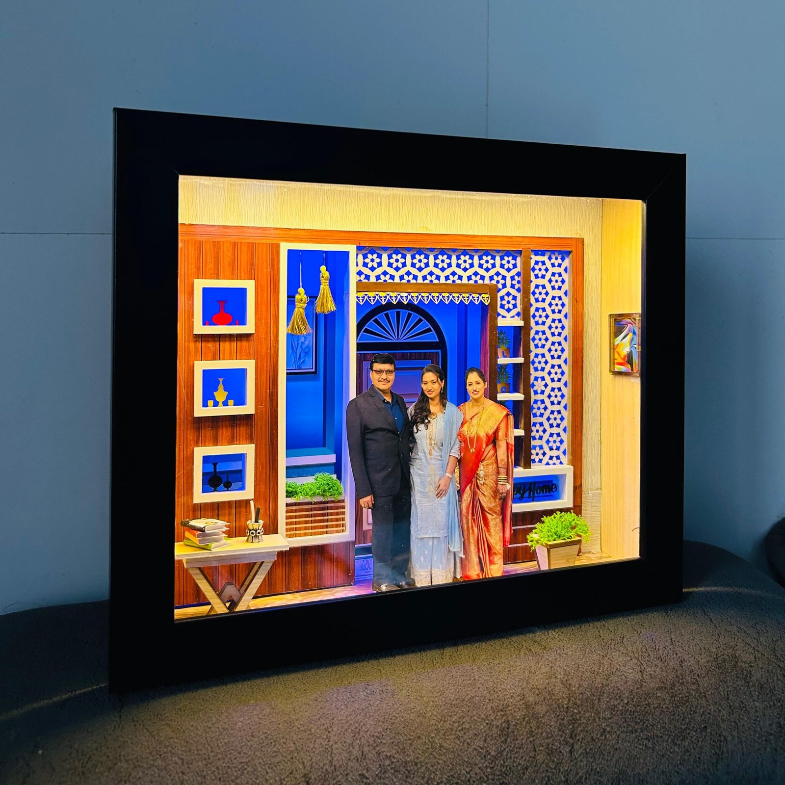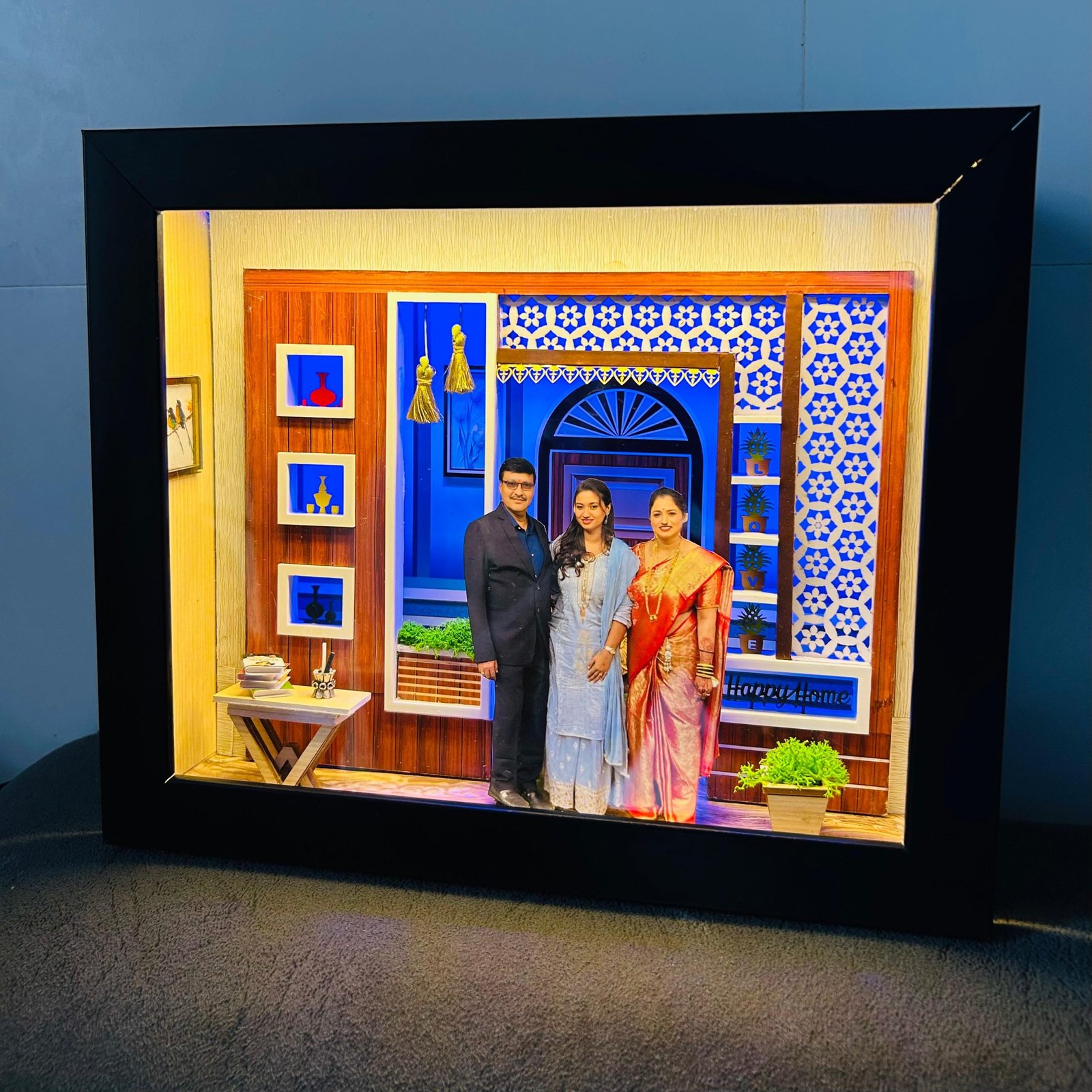Celebrate the warmth of family with this handcrafted Miniature 3D Frame, a unique piece of art designed to bring your most cherished memories to life. This exclusive collectible features double layers, a beautifully lit blue-tinted background for a calming ambiance and a golden-lit front layer to highlight your loved ones with a radiant glow.